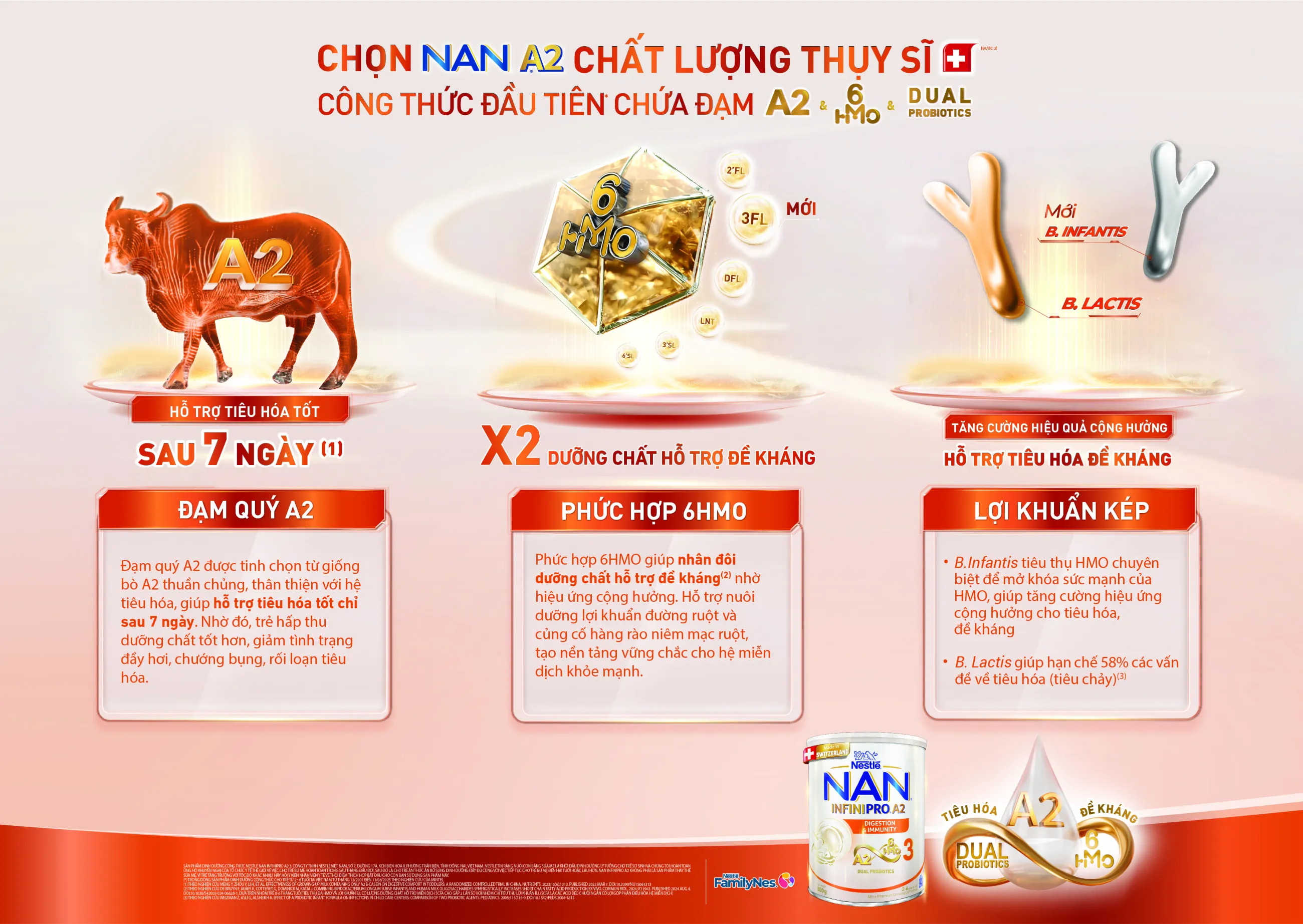 Nestlé NAN chính thức giới thiệu NAN INFINIPRO A2 BƯỚC 3 cải tiến mới tại sự kiện “Nâng tầm tiêu chuẩn khoa học dinh dưỡng – Tối ưu lợi thế đầu đời cho con”. Sản phẩm với công thức đầu tiên (1) kết hợp đạm A2, 6HMO và Lợi khuẩn kép hỗ trợ tăng cường hiệu ứng cộng hưởng cho tiêu hóa và đề kháng - hai nền tảng quan trọng cho sự phát triển khỏe mạnh của trẻ em ở giai đoạn chuyển tiếp.